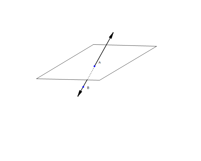 Line intersecting a plane at point A. The dotted portion of the line is occluded by the visible part of the plane.