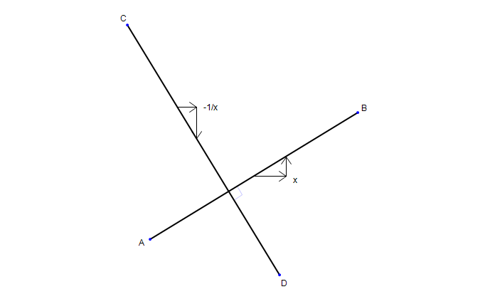 Perpendicular lines intersect at 90 degrees. One line's slope is the opposite reciprocal of the other's.